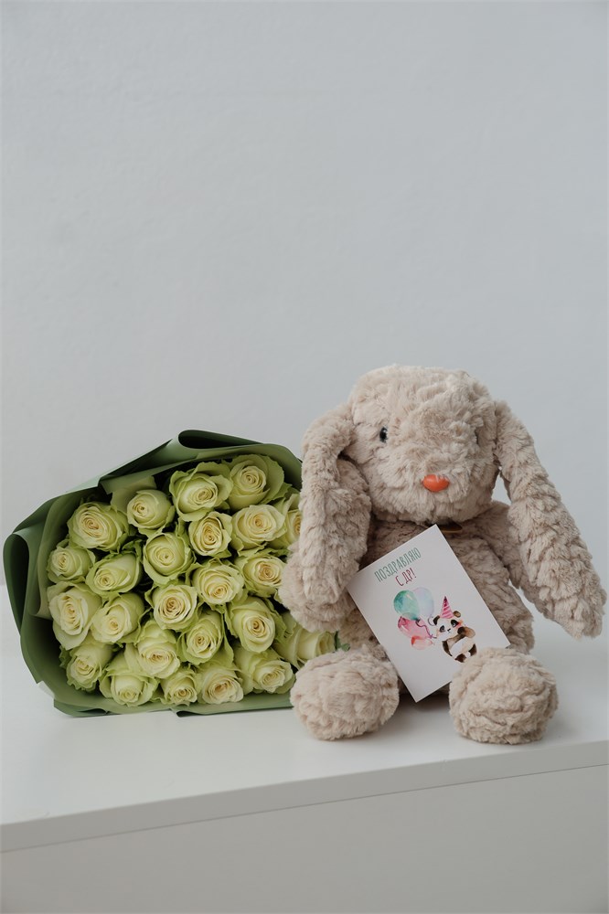Набор Розы Кения белые (25шт) + Зайка бежевый 25см с открыткой
