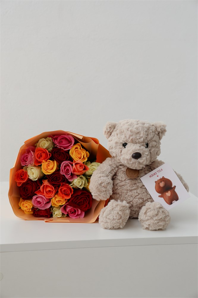 Набор Розы Кения МИКС (25шт) + Мишка бежевый 25см с открыткой